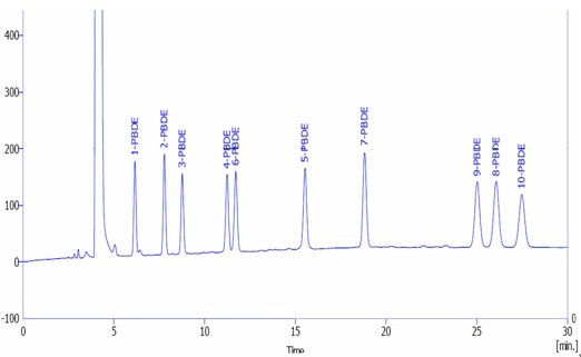 盟議會(huì)和理事會(huì)于2003年1月通過(guò)了RoHS指令,全稱是The Restriction of the use of certain Hazardous substances in Electnical and Electronic Equipment,即在電子電氣設(shè)備中限制使用某些有害物質(zhì)指令,也稱2002/95/EC指令,2005年歐盟又以2005/618/EC決議的形式對(duì)2002/95/EC進(jìn)行了補(bǔ)充,明確了六種有害物質(zhì)的最大限量值,這六種物質(zhì)分別為:鉛Pb、鎘Cd、汞Hg、六價(jià)鉻Cr6+、,多溴聯(lián)苯醚PBDE,多溴聯(lián)苯PBB。世界各國(guó)尤其是發(fā)達(dá)國(guó)家,對(duì)RoHS指令的出臺(tái)反響強(qiáng)烈,高度關(guān)注;中國(guó)是全球制造業(yè)大國(guó),也是產(chǎn)品出口大國(guó),出口總量的70%以上涉及到RoHS指令,因此中國(guó)政府亦十分重視相關(guān)問(wèn)題,并于2004年出臺(tái)了《電子信息產(chǎn)品污染防治管理辦法》,內(nèi)容類似RoHS指令,并準(zhǔn)備與其同步實(shí)施。作為該指令中的多溴聯(lián)苯醚類有害物質(zhì)----溴化阻燃劑,被廣泛用于多種消費(fèi)品中,包括電子產(chǎn)品、紡織品、家具、日化、玩具等,這些物質(zhì)的存在,一方面避免產(chǎn)品起燃,確保人類生活安全,然而另一方面,由于該類物質(zhì)在生產(chǎn)和回收中多有殘留,也已影響到人類的生活健康,這也是該指令頒布的初衷。針對(duì)該指令中多溴聯(lián)苯醚溴系阻燃劑的測(cè)定,國(guó)家公認(rèn)的檢測(cè)方法有GC/MS、GC/FID、GC/ECD、HPLC/MS/MS、 HPLC/UV以及紅外光譜法等,然而GC/MS、HPLC/MS/MS儀器價(jià)格昂貴,對(duì)人員的專業(yè)素質(zhì)要求高,對(duì)用戶來(lái)說(shuō),普及率不高,尤其是中小型企業(yè)相對(duì)難度加大,而GC/FID、GC/ECD、HPLC/UV均只對(duì)部分多溴聯(lián)苯醚進(jìn)行分離。本文在HPLC/UV的基礎(chǔ)上進(jìn)一步優(yōu)化,提出了一種方法簡(jiǎn)便、快速、準(zhǔn)確、靈敏度高、適應(yīng)性好、回收率高,可用于工廠質(zhì)量控制和檢驗(yàn)機(jī)構(gòu)樣品檢驗(yàn)的方法。