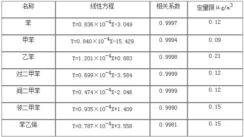 7種苯系物在進(jìn)樣量1-320ng范圍內(nèi)線性相關(guān)系數(shù)為0.9981-0.9999,線性關(guān)系良好。以響應(yīng)信號為基線噪聲10倍時對應(yīng)的進(jìn)樣濃度作為定量限,確定物質(zhì)的定量限均小于0.21μg/m3。
