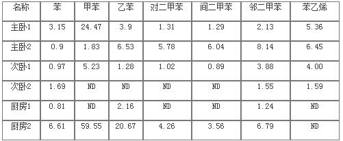 在剛裝修完的兩套住宅的三處不同地點進(jìn)行取樣并分析7種苯系物的含量,測試結(jié)果見表7。