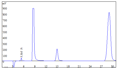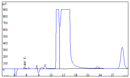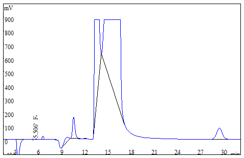 將大米、茶葉試樣分別粉粹后過篩,各稱取0.25g(精確至0.0001g),于氧彈燃燒儀進(jìn)行燃燒,冷卻后定容,經(jīng)0.22μm的水系濾膜過濾后上機(jī)得到樣品譜圖,如下圖3、圖4所示;食用油樣品直接稱重后進(jìn)行氧彈燃燒,測試得到的譜圖如圖5所示;生活飲用水直接上機(jī)后得到樣品譜圖詳見圖6。其中大米、茶葉、食用油中氟離子的測定結(jié)果均低于方法檢出限,同時(shí)對(duì)4種試樣進(jìn)行了加標(biāo)處理,加標(biāo)回收率在95.6%~102.3%之間。測試數(shù)據(jù)詳見表2。