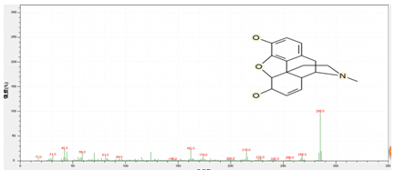 利用罌粟殼生物堿的理化性質,樣品在強酸環(huán)境下(pH:1-2),采用氣相色譜質譜聯(lián)用儀進行檢測。采用保留時間和標準質譜圖特征離子進行定性,外標法定量。